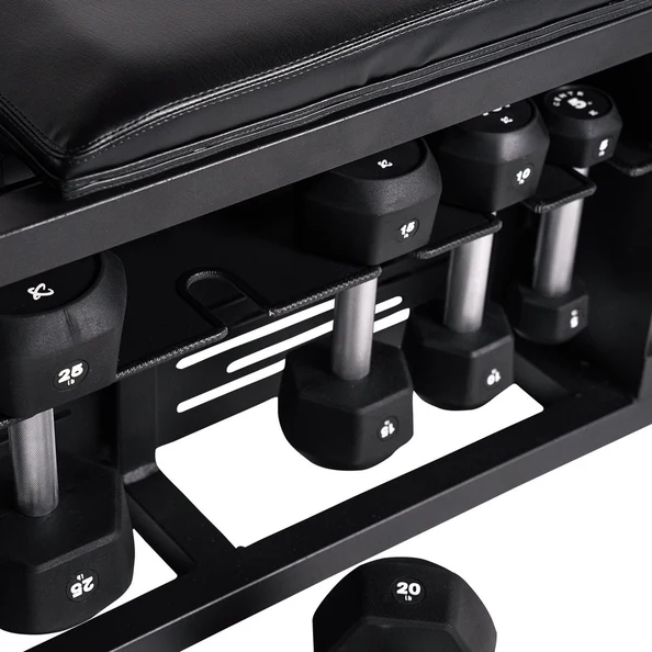 • Built-in dumbbell rack holds up to 6 pairs underneath the bench