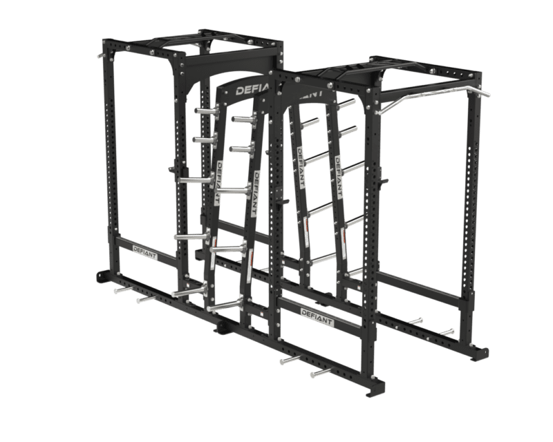 The Defiant Strength Rack Series, constructed from robust 11-gauge steel, features 3×3 uprights and offers 2-inch incremental height adjustments. This series includes customizable options, standard bar storage, band pegs, and multi-grip pull-up crossbars. Available configurations include the Power Rack, Half Rack, Double Half Rack w/Single Storage, Double Half Rack w/Dual Storage, Power Half Rack w/Dual Storage, and Power Rack Combo w/Dual Storage.