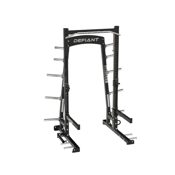 The Defiant Strength Half Rack | TKO (DS-901HR) combines durability, functionality, and versatility to meet the demands of professional gyms, home fitness setups, and military training centers. Built with a 3x3x11g steel frame and a thoughtful design, this half rack offers exceptional stability for a wide range of strength training exercises. Featuring a stainless steel knurled chin-up bar, angled plate storage system, and adjustable J-cups and safety stops, it’s engineered to deliver optimal performance and safety during heavy lifting sessions. With 25 holes on the front, back, and sides of the uprights, users can easily customize their workouts by attaching accessories like jammer arms or battle ropes. The angled plate storage system ensures Olympic plates remain secure, while the bolt-in design provides added stability for high-intensity workouts.