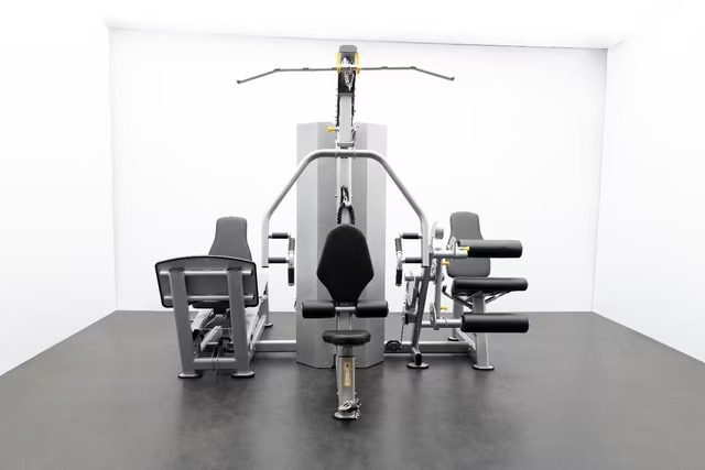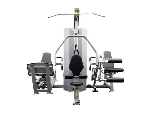 The BodyKore 3station multi-gym is perfect for full body strength building. The stations include a lat pull down/chest press station, Leg Extension/Curl Station and a seated leg press. Each station is equipped with 220lb weight stack and the cable attachment used in the station. This machine is commercial grade and rated to hold over 1000lbs.