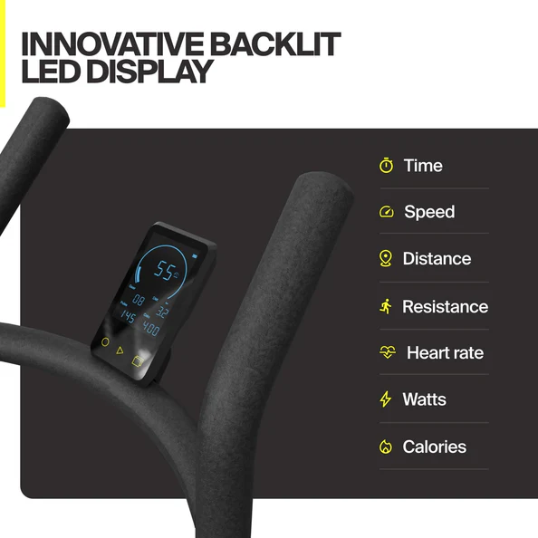 4.8” LED Shows: Resistance, Time, Distance, Heart Rate, Watts, Calories, Speed, Bluetooth Connection