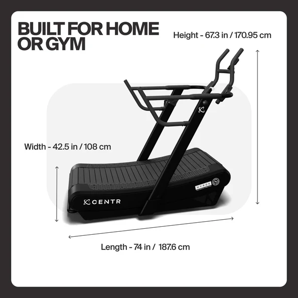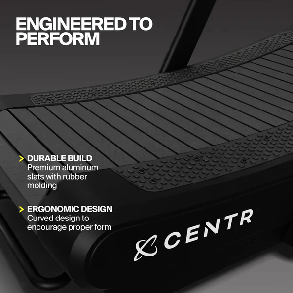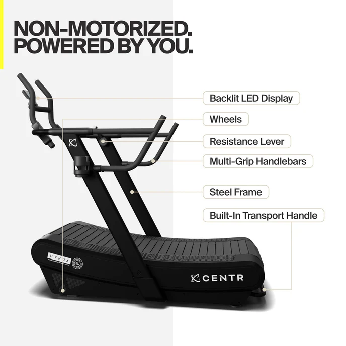 The Centr x HYROX Perform Treadmill is a motorless running machine made for athletes and next-level performance. This motorless curved treadmill design encourages proper form, while the cushioned, shock-absorbing surface maximizes endurance and stamina so you can conquer your runs and sled-push simulations.