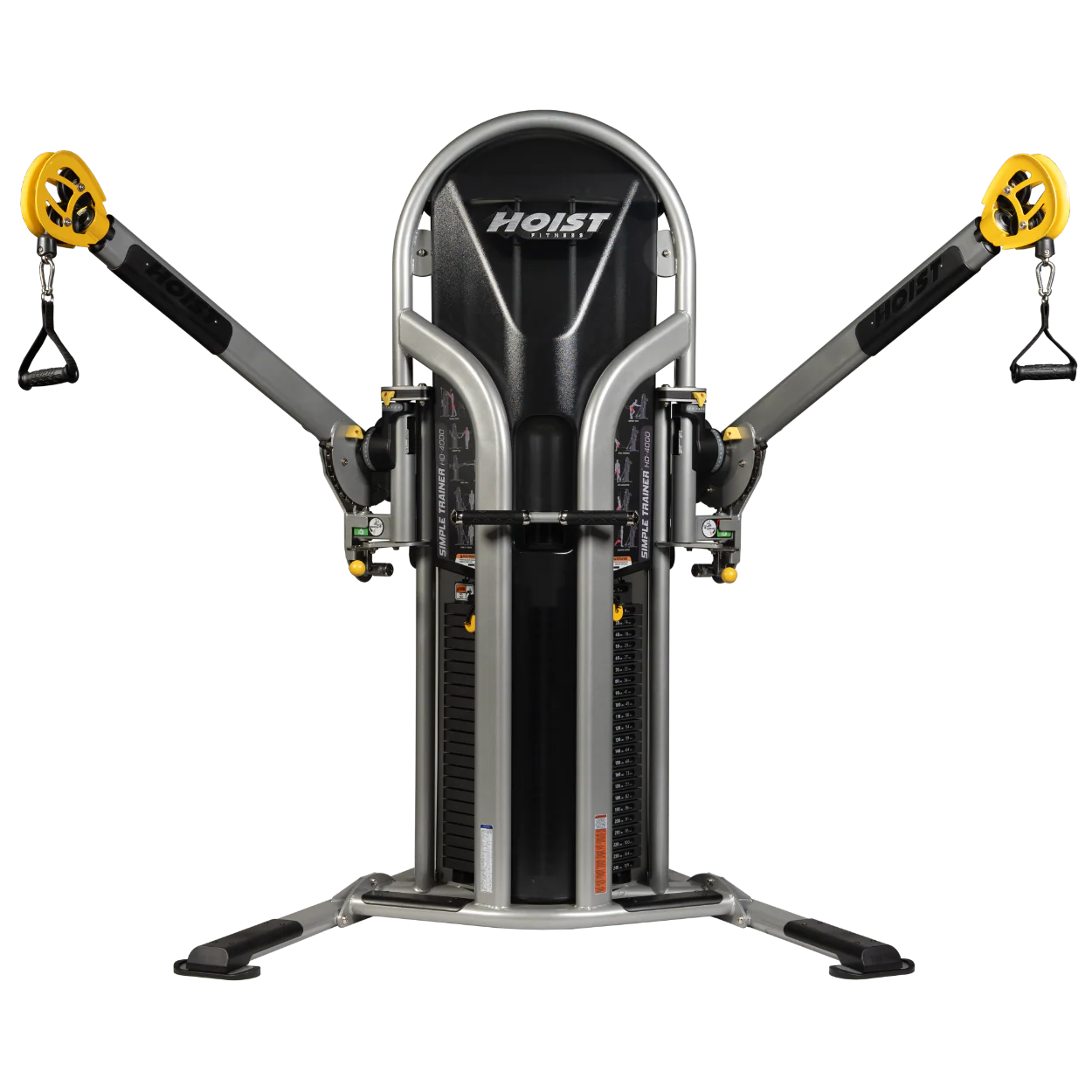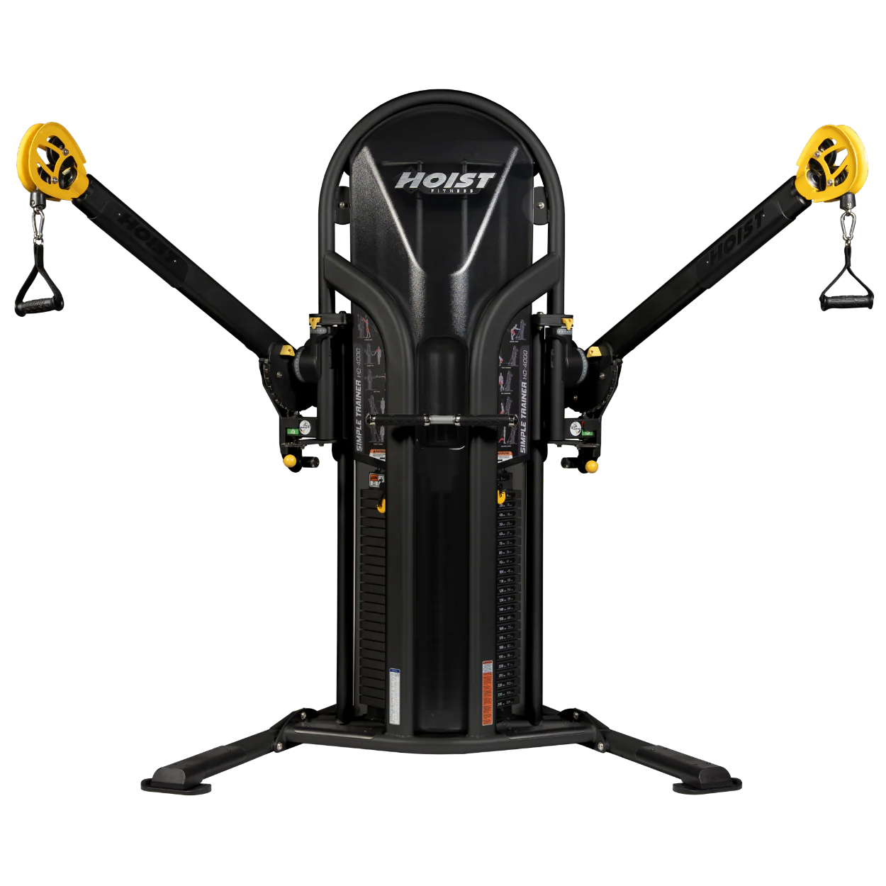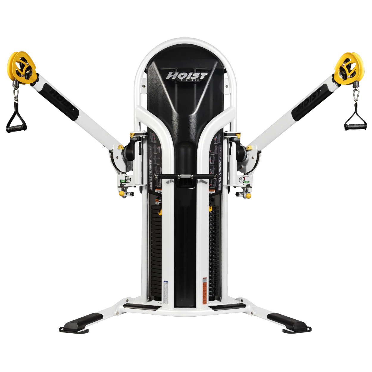 The HOIST® Simple Trainer takes functional training to the next level with HOIST’s® patent-pending, dual-axis adjustment system that controls both vertical and horizontal adjustment of the arms – at the same time! – with a single easy-to-adjust lever per side. With 12 height positions and 9 width positions for each arm, this easy-to-use, quick-set functional trainer will get your clients lifting faster – and having more fun – in your commercial or light commercial fitness space. Our Simple Trainer’s cables remain centered with the axis of arms’ rotation, preventing slack as adjustments are made, while providing a smooth, consistent feel for users. Accessories include stabilizing handles and water bottle/phone holder.