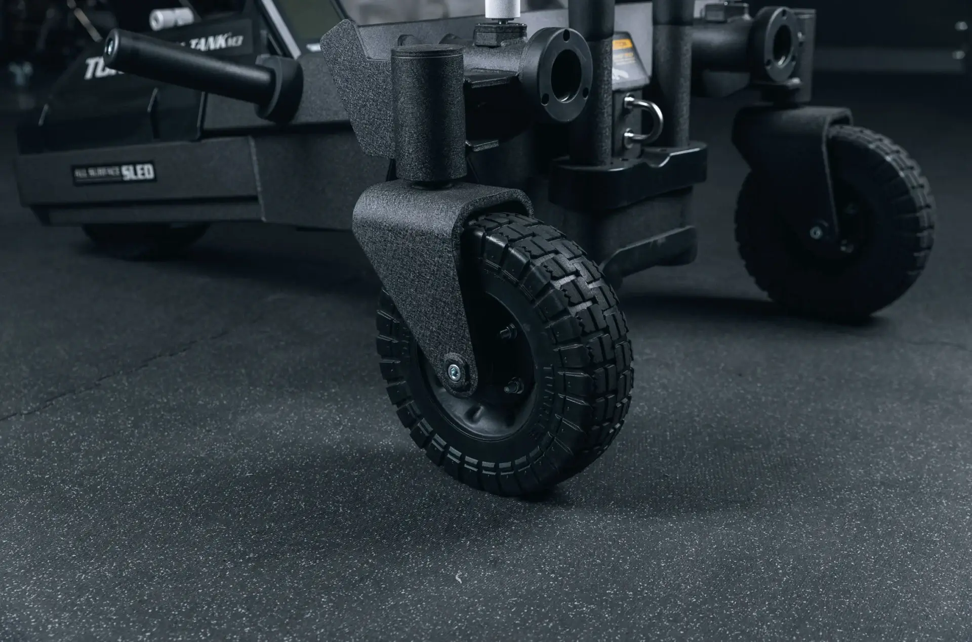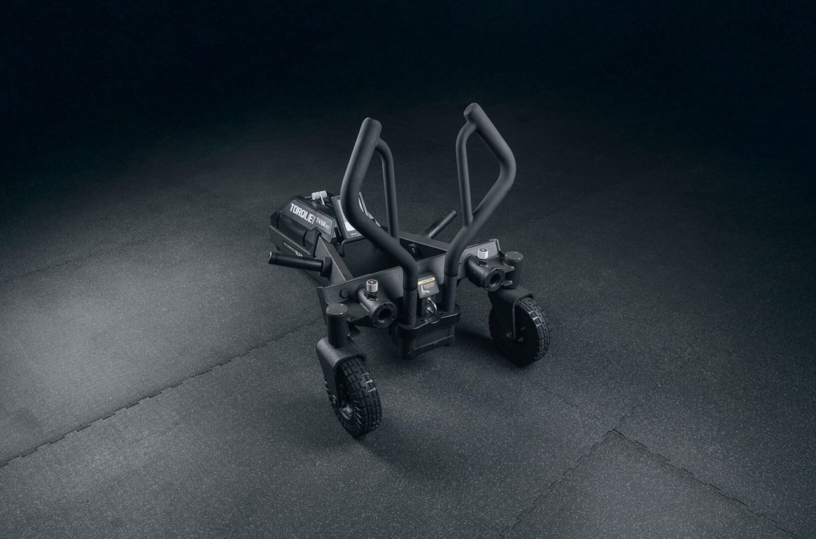 Black fitness sled on dark floor.