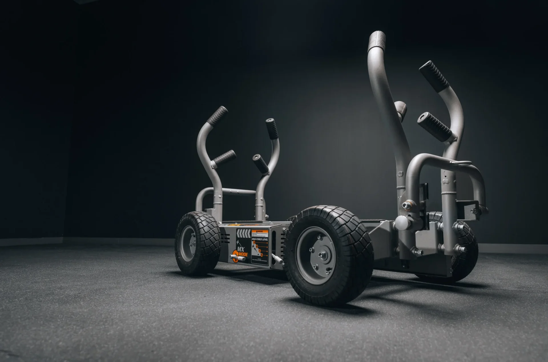 Heavy-duty dolly on a dark floor.