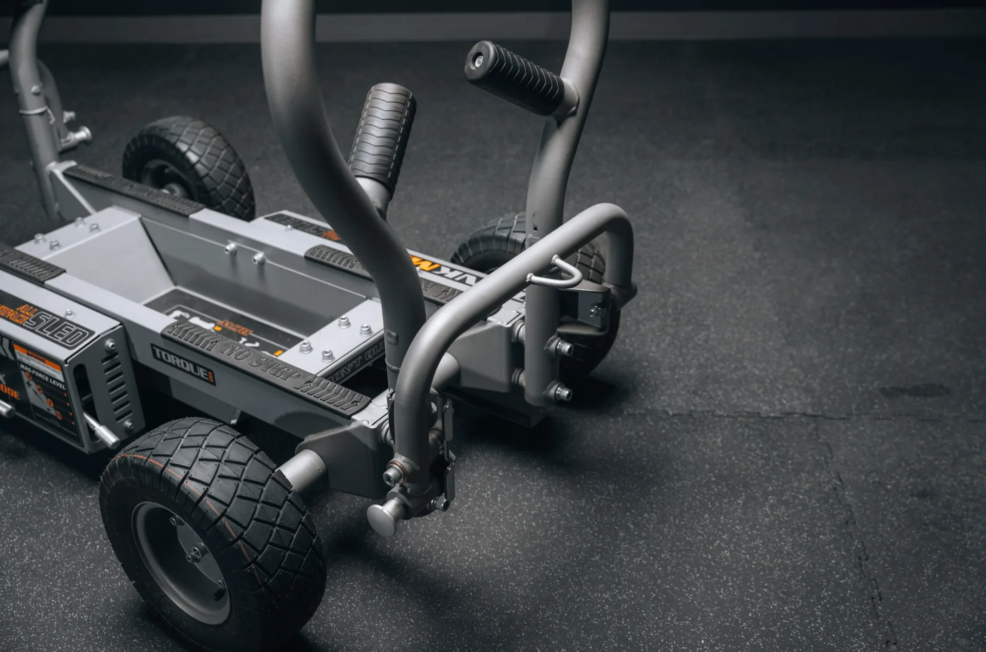 Gym equipment with handles and wheels.