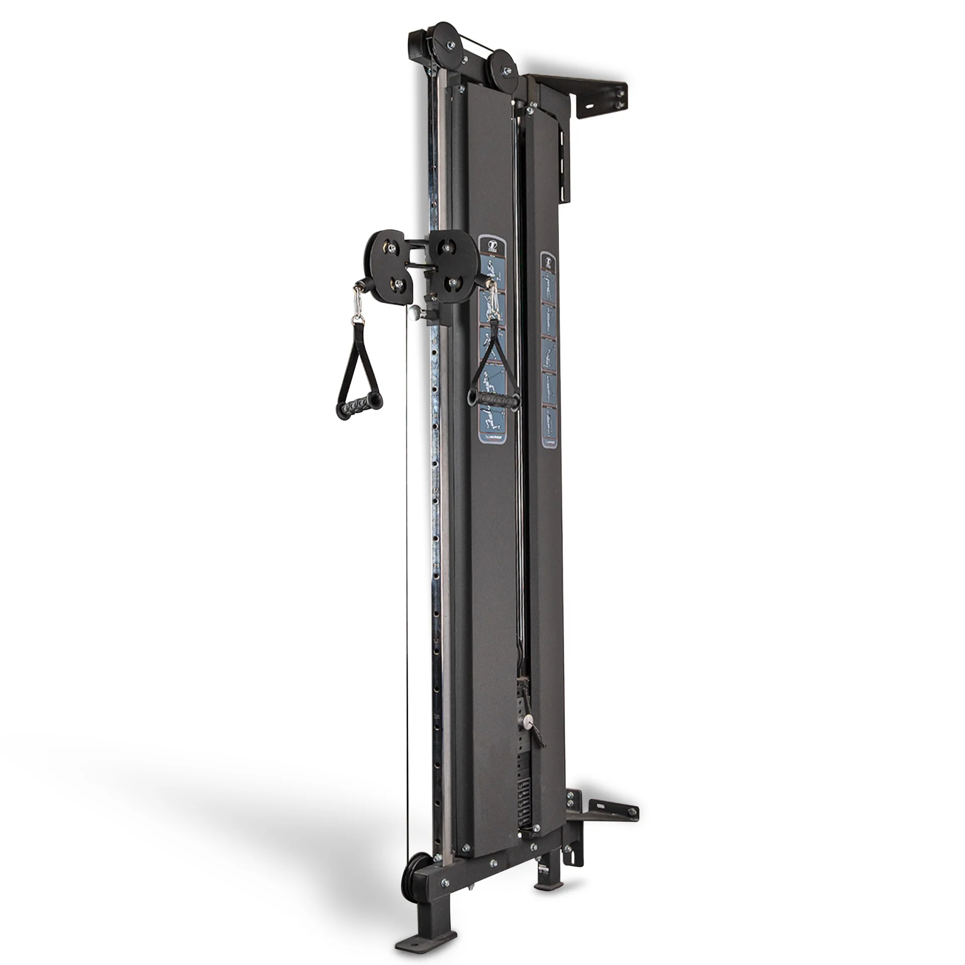 The Wall-Mounted Cable Component has dual swivel pulleys for isolateral movements with a 1:2 ratio that provides 10 ft (3.1 m) of cable travel. To provide three different pulley widths, you can pair two stations together to create a cable-crossover.